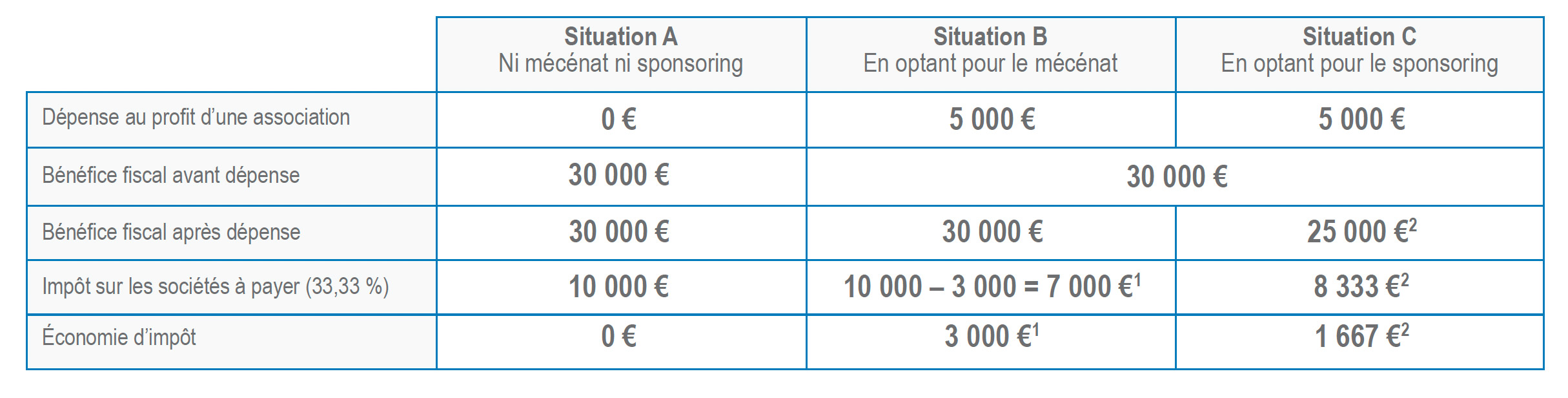 (2) Le sponsoring étant considéré comme une charge d’exploitation, il vient en déduction du bénéfice (30 000 – 5 000 = 25 000). Le montant de l’impôt sur les sociétés à payer sera de 8 333 € (0.3333 * 25 000 = 8 333).